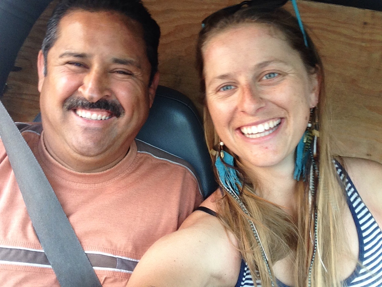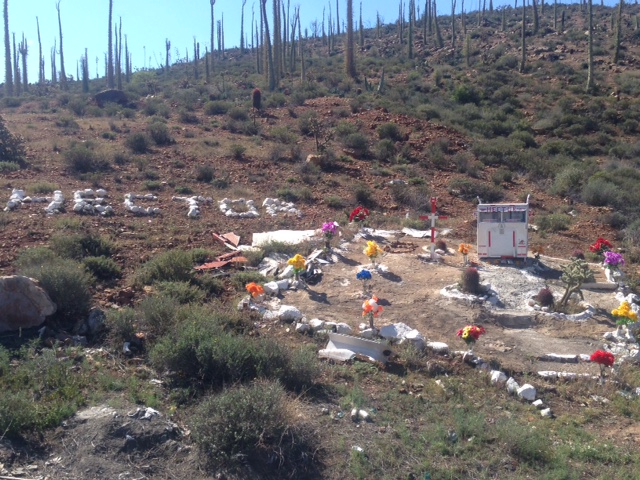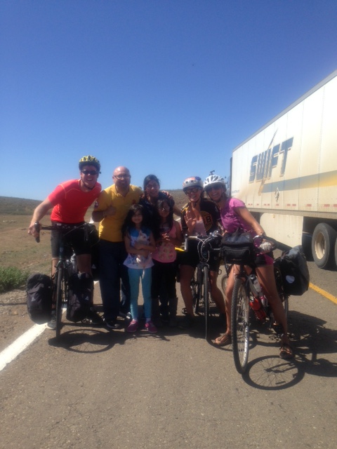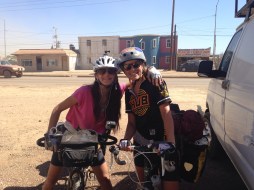 Leaving San Quintin with a new riding partner was by far the worst ride we have experienced yet! I have a new friend, Maud from France who is riding from LA to Peru alone. We decided to ride together and our first experience was in 107 degree weather and incredible side winds creating a tornado of dust and rocks and making it quite dangerous when riding alongside trucks and cars that block the wind and then suck you in near their wheels as they unblock the wind from you. We only made it 30 km when Maud felt sick and we paused on the side of the road. Here we were stopped by a green truck where a Mexican American Alejandro appeared like an angel.