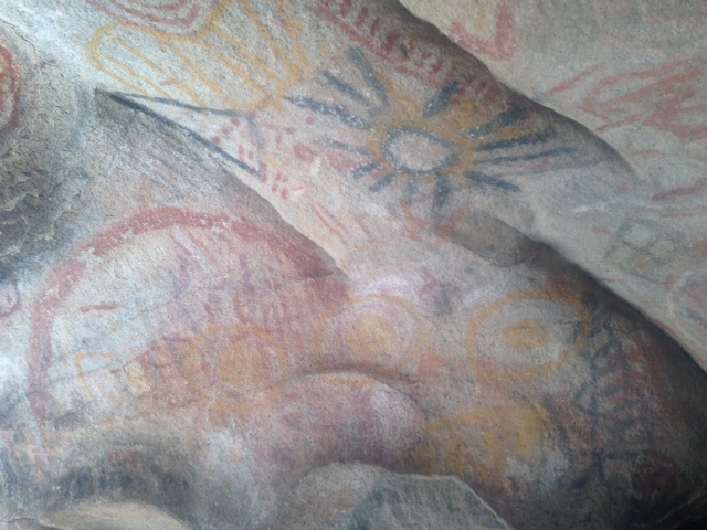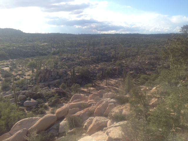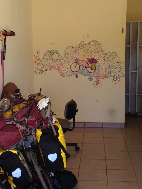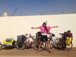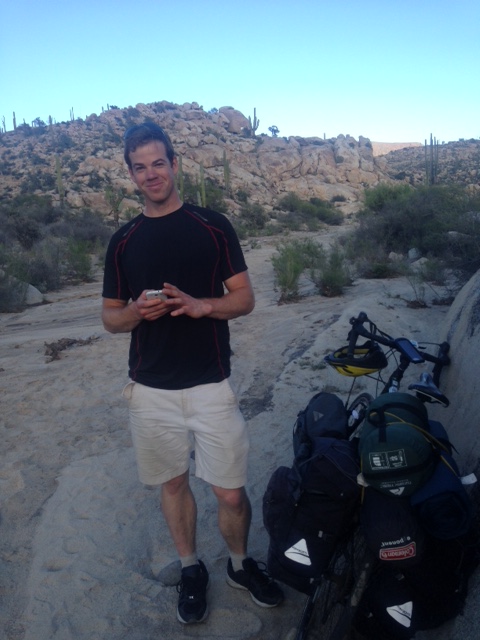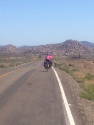 One day we were riding through the desert exhausted and with unbearable heat and flagged down 5 cars for water. 4/5 cars were American and gifted us water, Gatorade and one person even had Halloween bags of candy for us ha. People are very generous on the road. Then we continued 30 km more to the closest town Katayina where we were in awe of the change of scenery from desert nothing to huge giant boulders and enormous towering cactus. Here they call the town an oasis and there are petroglyphs still preserved you can walk right up to and a river! We took a whole day off and swam in the river and enjoyed the oasis while we had it. That was our first rinse in 4 days! While Maud, my friend and I were checking out the petroglyphs high up in a cave we saw from way below a tiny figure with a bike! Another cyclist!