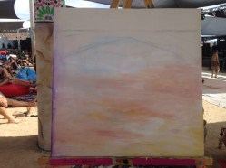 This year I decided to listen to some music and enjoy the festival before I immediately started painting. Last festival I had to paint an 8 foot by 6 foot piece so I was a bit more stressed out. This year it was 2 1/2 feet by 2 1/2 feet and I could carry it with me wherever I wanted. There was shade, thank goodness and I could actually listen to all the live music and I met a lot of people because they would enjoy the progress of my piece throughout the festival.