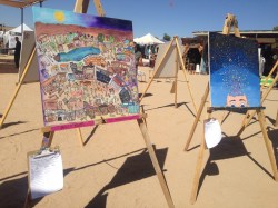 I spent most of my time shaded in the “Bowl” that included 3 musical stages and performances from 10am-11:30 pm with artists rotating almost every 1.5 hours. I listened to almost every set of music that was played. Quality music and painting combined made for a dreamy weekend. Below you can also see the silent art auction and how they set it up for us on the sunny Sunday morning of the festival. People could go around and write on the clip board how much they wanted to bid. I was a little nervous!