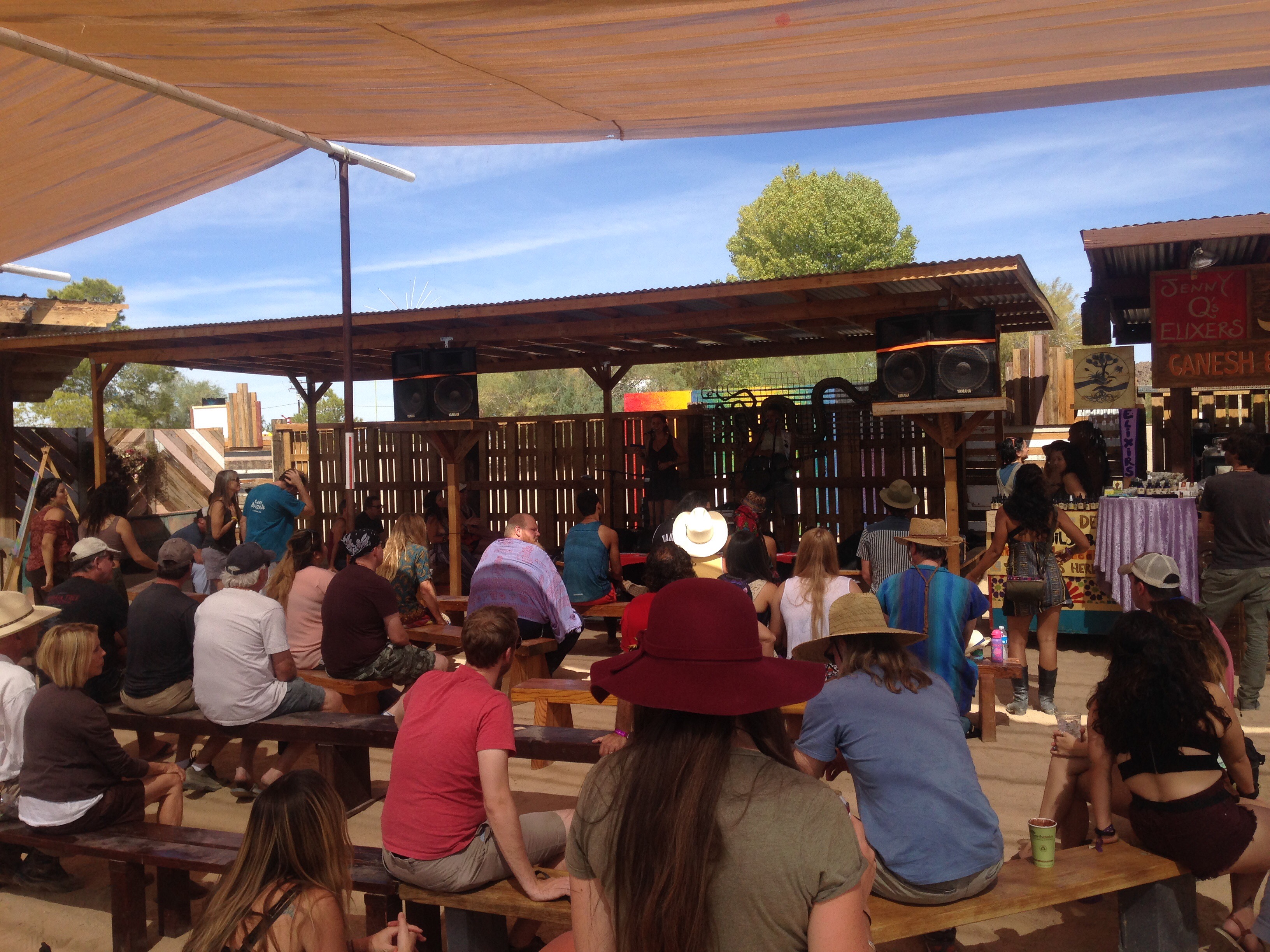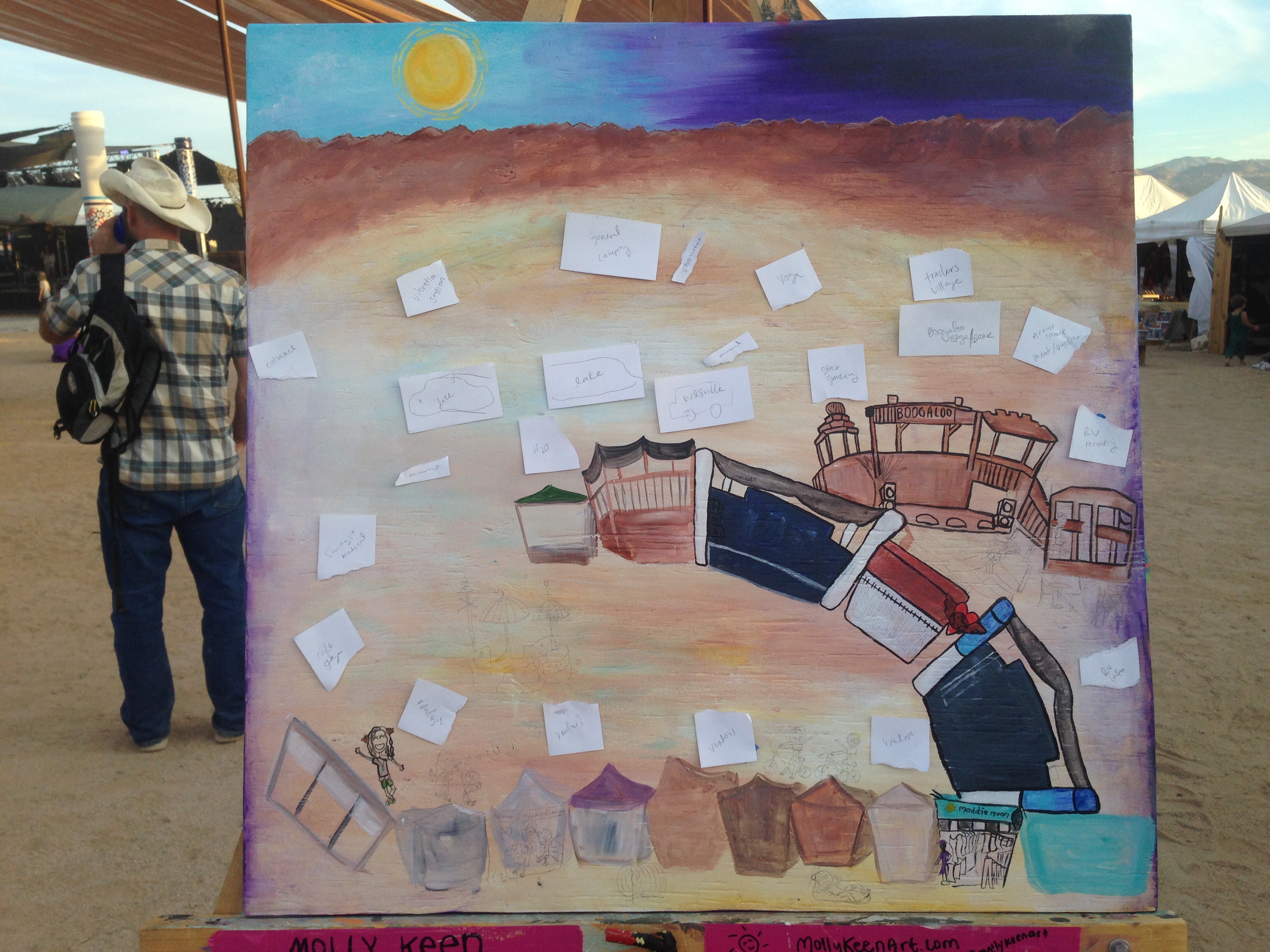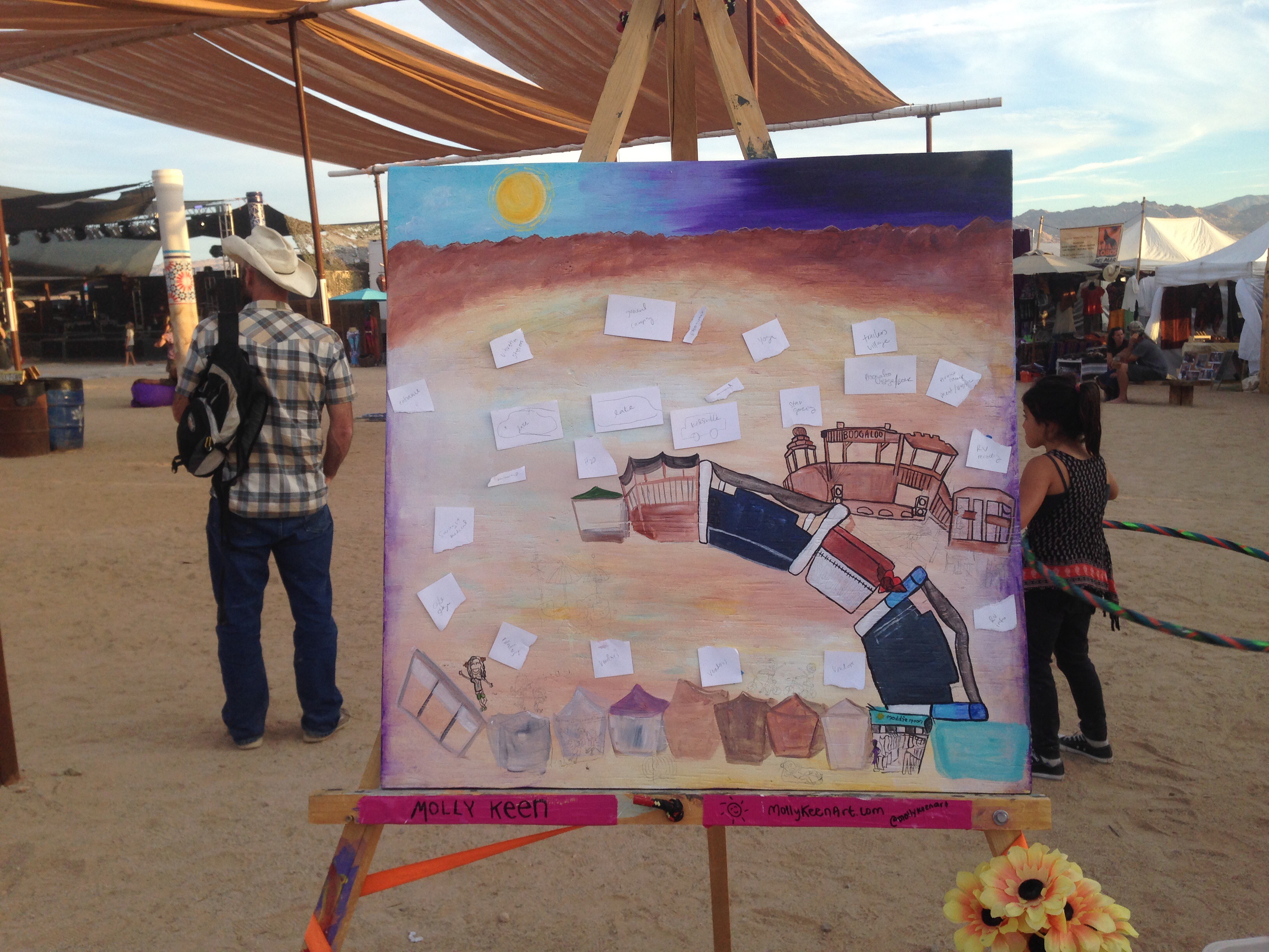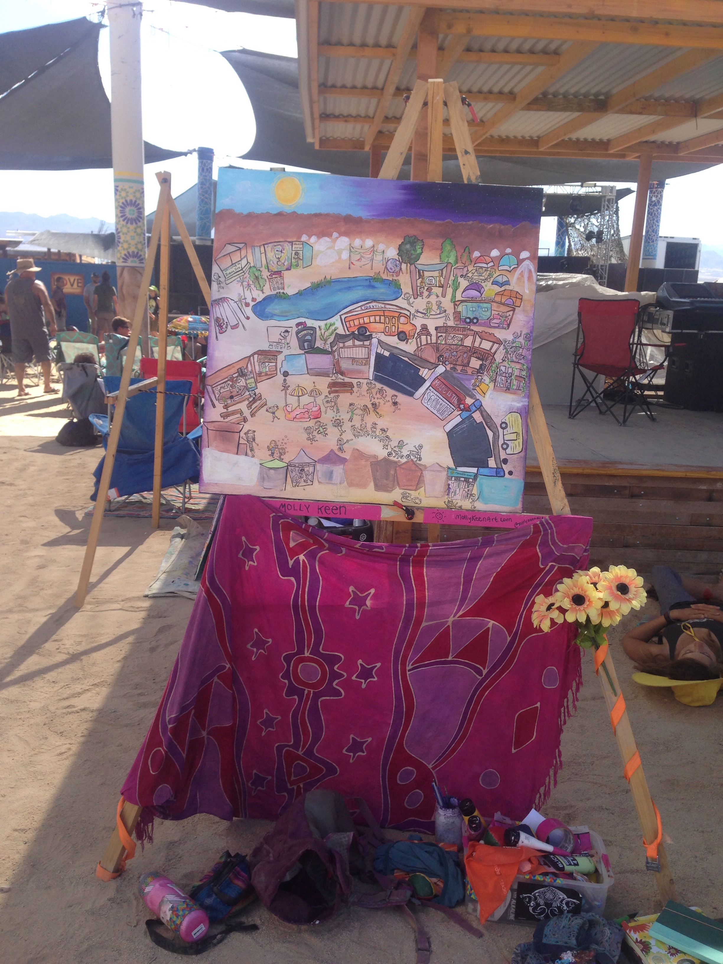 I spent most of my time shaded in the “Bowl” that included 3 musical stages and performances from 10am-11:30 pm with artists rotating almost every 1.5 hours. I listened to almost every set of music that was played. Quality music and painting combined made for a dreamy weekend. Below you can also see the silent art auction and how they set it up for us on the sunny Sunday morning of the festival. People could go around and write on the clip board how much they wanted to bid. I was a little nervous!