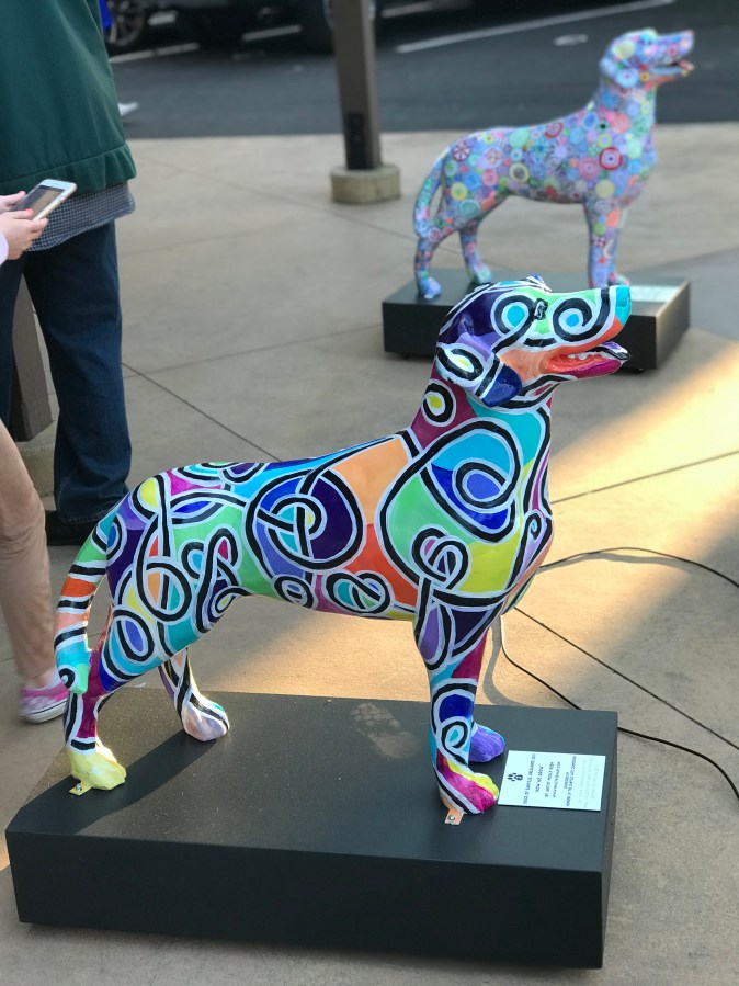The art opening took place on May 9th, 2019 at the Village Theatre and Art Gallery in Danville, CA, where all 15 artists celebrated their works. The installation of the dogs happened after the celebration where they found semi-permanent locations throughout Danville. My piece was the unique and lucky one to stay at the Village Theatre, welcoming guests and patrons of the theatre at the front entrance.